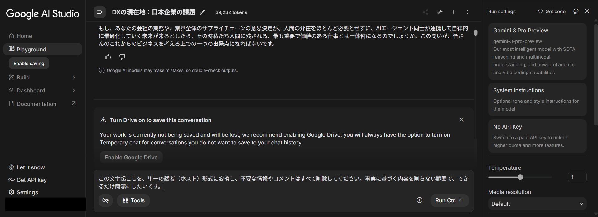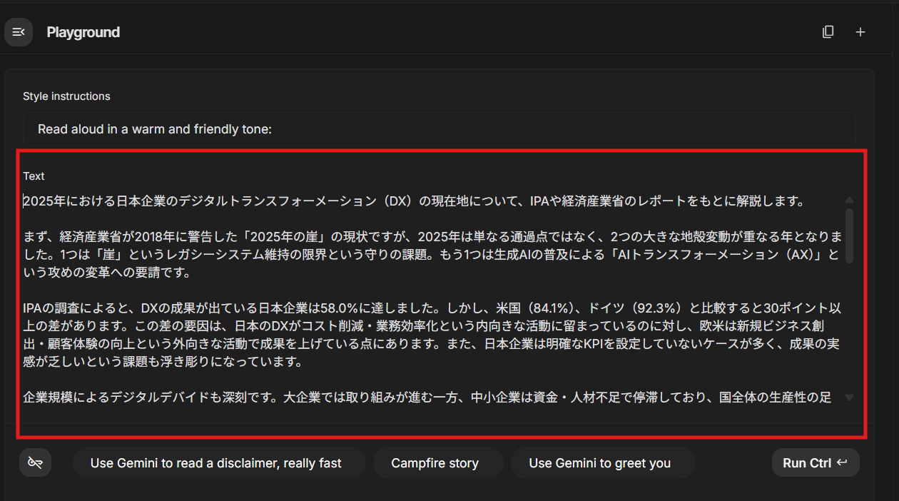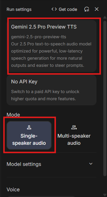 生成された要約テキストをコピーしたら、Google AI Studioのモデル設定を変更します。モデルを「Gemini 2.5 Pro Preview TTS」に変更し、モードも「single speaker audio」に切り替えてください。
