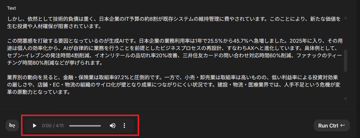 設定変更後、先ほどコピーした要約文章をテキスト欄に貼り付け、実行します。しばらく待つと、単一話者による音声が自動生成されます。生成された音声ファイルはダウンロードも可能なので、スマートフォンに保存して外出先で聞くこともできます。